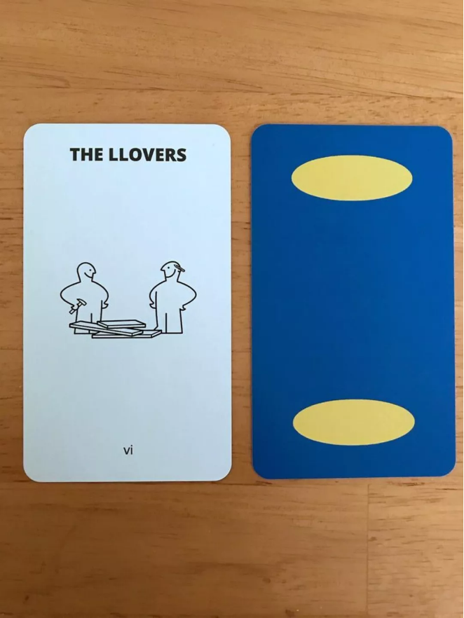 Unlike traditional tarot cards, this deck features simple black lines with a white background, presenting images related to Ikea (such as furniture, Ikea architecture, etc.)