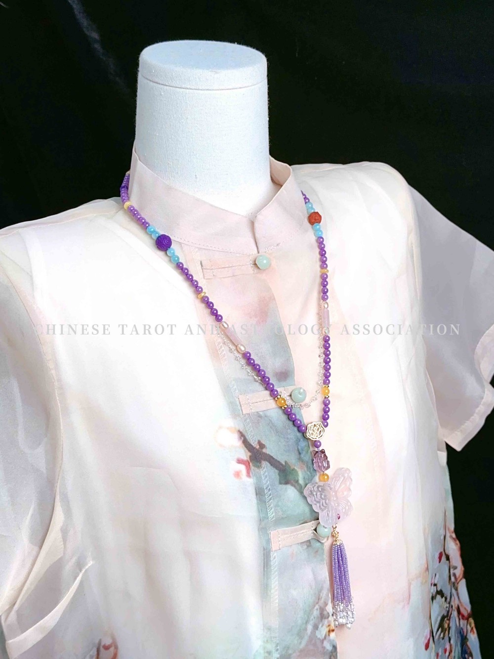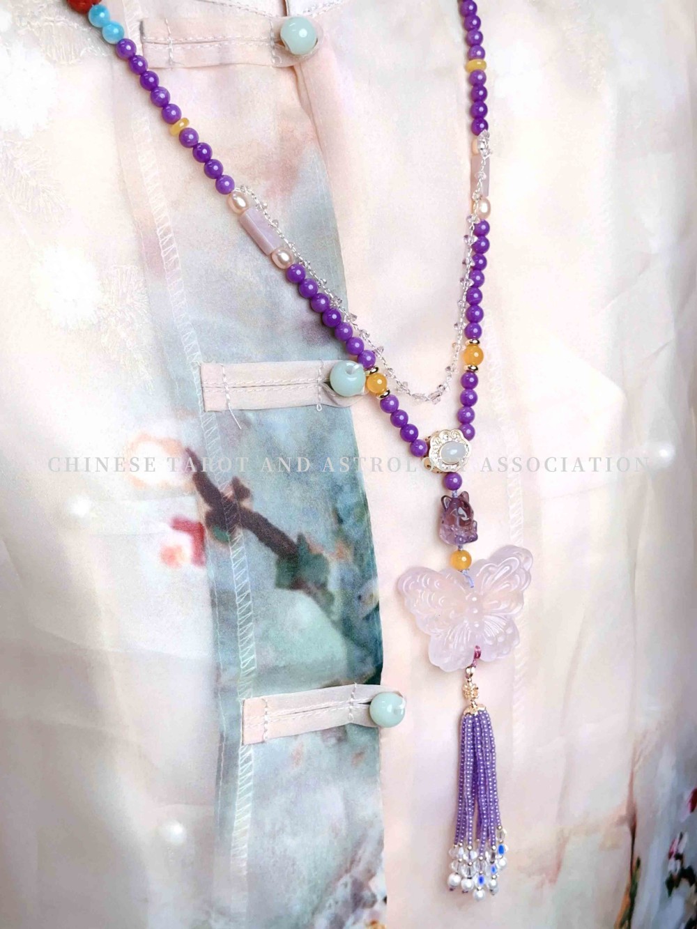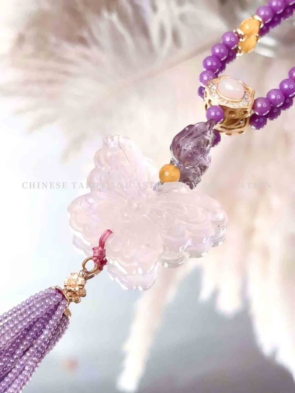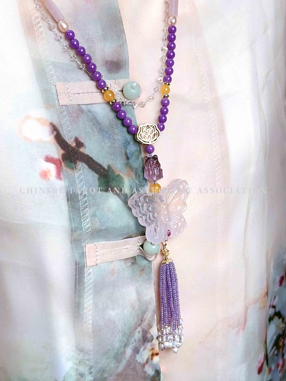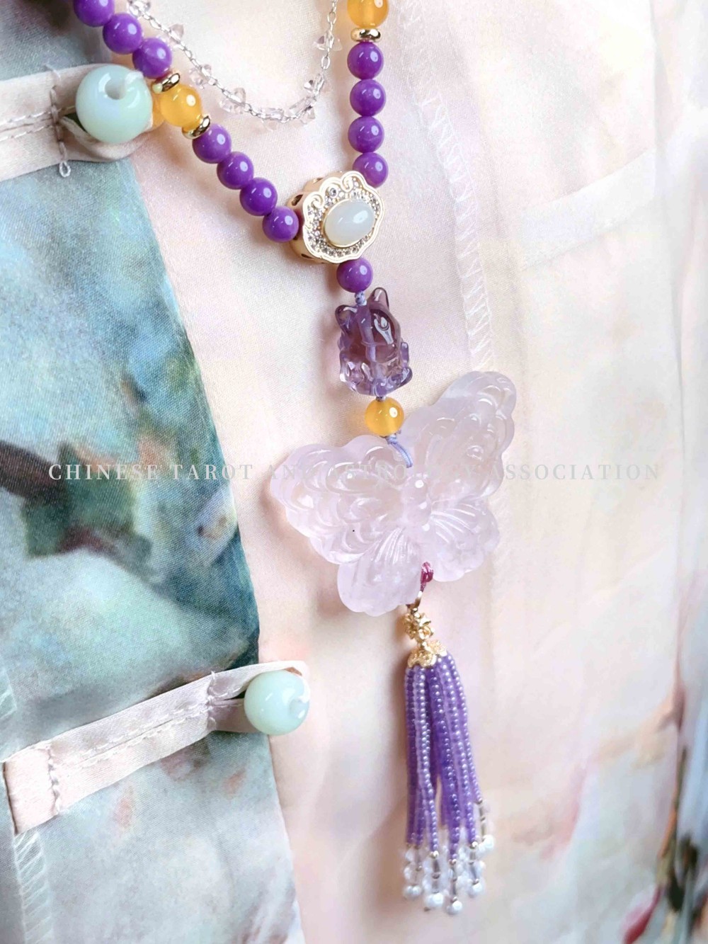 "Pink Crystal Butterfly & Amethyst Fox & Purple Lepidolite Tassel" Neo-Chinese Necklace 价格: