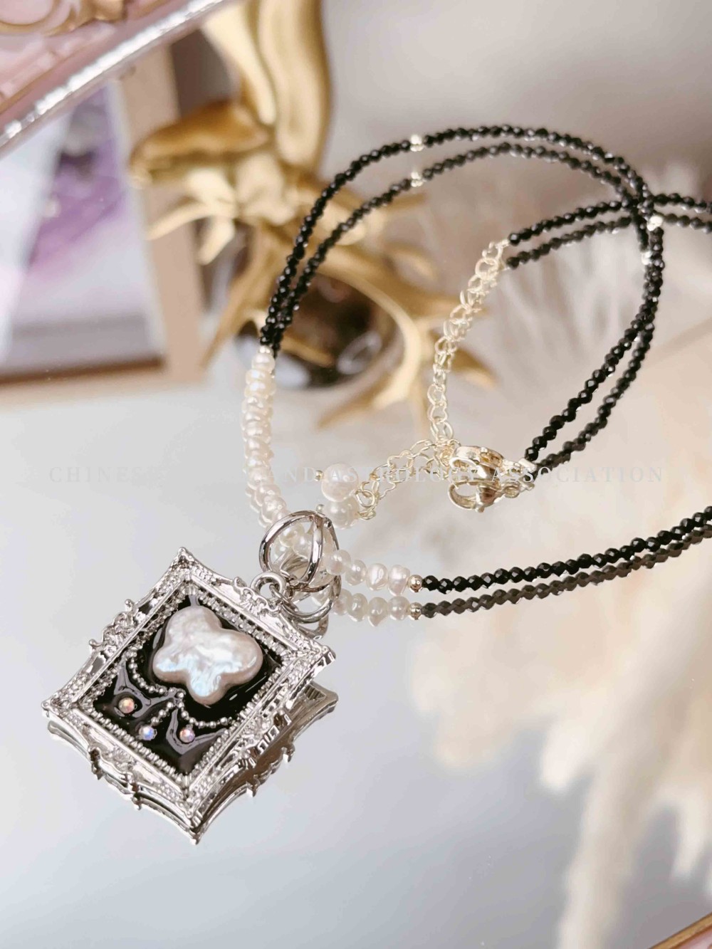 "Pearl Butterfly Pendant & Black Spinel Pearl Bead" Necklace
