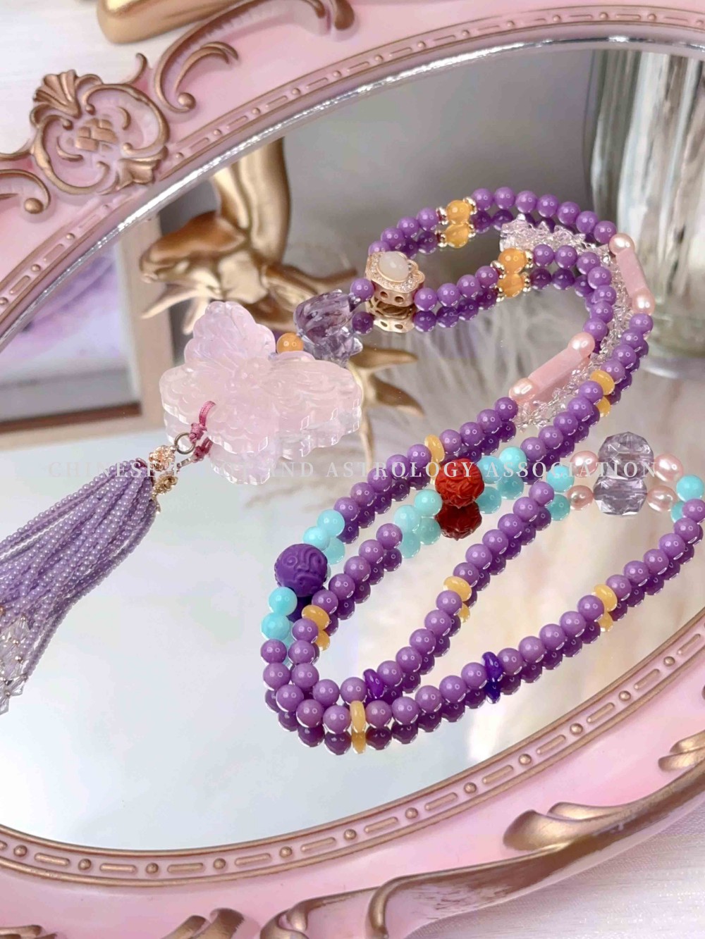 "Pink Crystal Butterfly & Amethyst Fox & Purple Lepidolite Tassel" Neo-Chinese Necklace