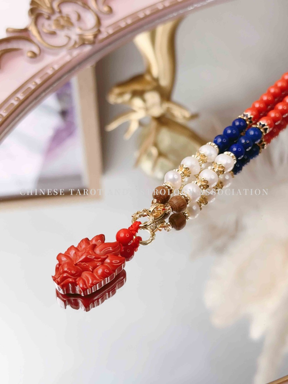 "Fire Fox & Red Cinnabar & Lapis Lazuli & Pearl" Necklace